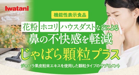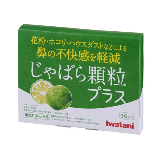 「じゃばら顆粒プラス」は、機能性関与成分であるジャバラ果皮粉末エキスを配合した顆粒タイプのサプリメントです。ジャバラ果皮粉末エキスには、花粉・ホコリ・ハウスダストなどによる鼻の不快感を軽減する機能があることが報告されています。本品は、機能性表示食品として届出された新商品です。