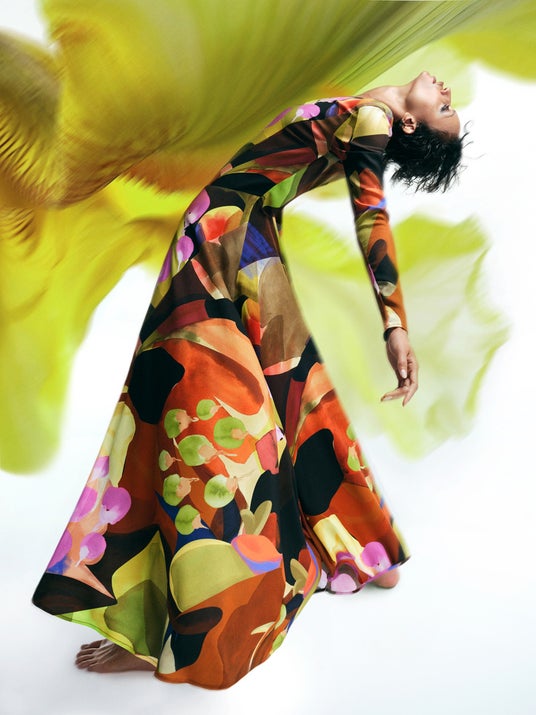 パンジープリントのメッシュドレスにフリルのディティールでボリュームと動きをプラス。格上げされたイブニングルックに最適。