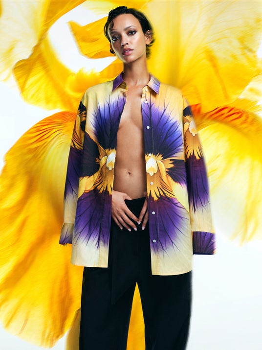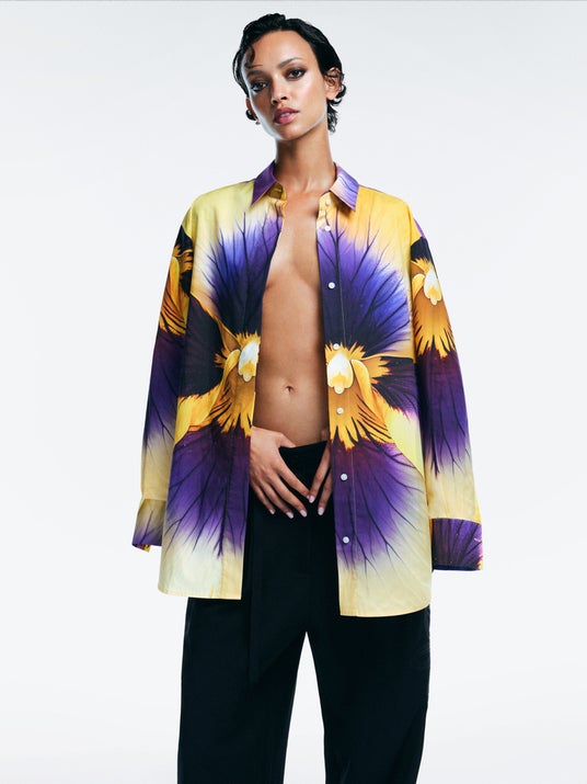 正面に大きくプリントされたパンジーが象徴的なシャツと黒のテーラード・パンツは、あなたのワードローブを花で溢れるものにしてくれるで