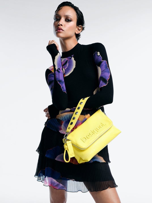 フリル付き花柄ドレス ¥22,900(tax in) レザー風ショルダーバッグ¥13,900(tax in)
