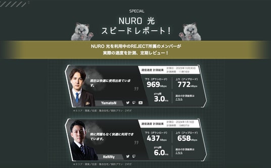 - 「NURO 光」を利用する「REJECT」所属のメンバーが実際の速度を計測し、定期レビューを実施。