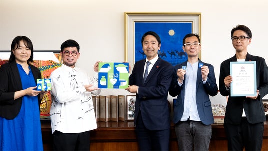 左から、株式会社オインクゲームズ 稲垣 敬子、株式会社オインクゲームズ 代表取締役 佐々木 隼、鎌倉市 松尾 崇市長、鎌倉エシカルラボ 稲葉 哲治氏、鎌倉市 市民防災部 商工課 角田 如生氏