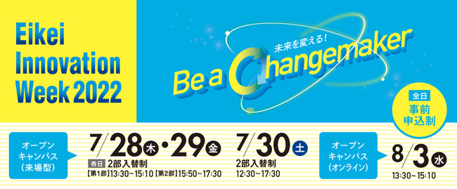 7月28日(木)から8月3日(水)まで、高校生・受験生、保護者、高校教員等を対象に、「Eikei Innovation Week 2022 」と題して、「叡啓大学を知る1週間」をテーマに、オープンキャンパスを開催します!
