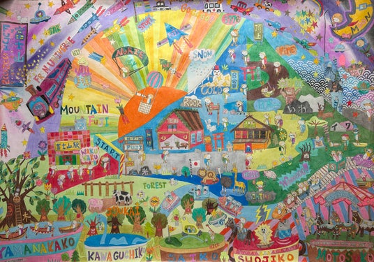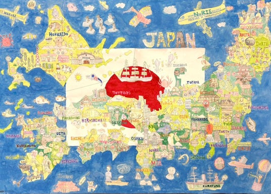 4人の子ども達(2歳、4歳、9歳、11歳)と一緒に家族みんなで挑戦しました。「これみかんだよね?」「これラベンダー畑かな?」「大阪はやっぱりたこ焼きだねー」「次は四国にも行ってみたいなー」などとおしゃべりをしながら塗っている姿は、とても微笑ましくて賑やかでした。小学生の2人は、パソコンを片手に地図上の歴史人物を調べたり各県の産物を確認したりしながら進めていて、都道府県の勉強にもなりました。細かいところは繊細に色鉛筆、文字ははっきりとカラーペン、背景は丁寧に絵の具で仕上げました。 背景は、日本の産物や歴史に誇りを持って…という想いを込めて、小さな子でもパッと見て日本地図とわかるように、大きな国旗と広大な海で表現しました。