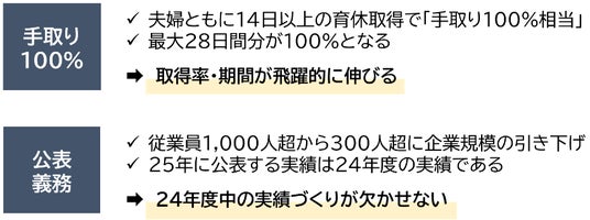 2025年4月1日に育児・介護休業法が改正され、従業員300人超の組織の男性育児休業取得率の公表が義務化されることになりました。これにより男性育休取得率が高い組織ほど就活生や投資家から選ばれるようになることが予想されます。そのほかにも同日の法改正で、夫婦で14日以上育児休業を取得すると最大28日間手取り10割相当が給付される制度が創設されます。これによりさらなる育休取得率や取得日数の増加が予想されます。