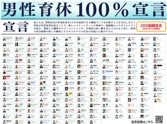 ▲「男性育休100%宣言」に賛同する組織一覧(2024年12月時点:200社) https://work-life-b.co.jp/mens_ikukyu_100/