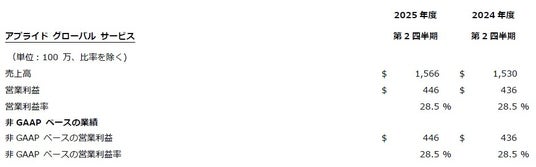 アプライド マテリアルズは、一部の項目について投資家の皆様に非GAAPベースの財務指標もお伝えしています。これは一部のコスト、経費、損益項目の影響を調整したもので、この中には統合・買収に関連する一部の項目、リストラクチャリングおよび退職に伴う費用とそれに関連した調整、資産減損、戦略的投資の売却損益ならびに配当と減損、一部の法人税項目やその他の個別調整などが含まれます。非GAAPベースでは、株式ベース報酬に関連する税効果を、会計年度を通して按分計上しています。こうした非GAAPベースの数値と、GAAP(一般会計原則)に基づいて算出・表示された最も直接比較し得る財務数値との差異調整方法は、本リリースの財務諸表中に示されています。