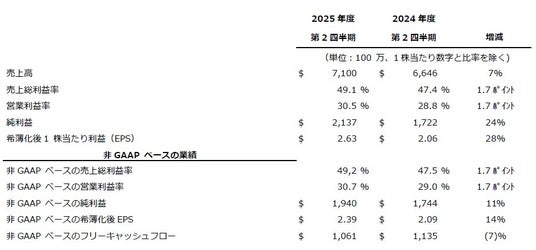 シニアバイスプレジデント 兼 最高財務責任者(CFO)ブライス・ヒルは次のように述べています。「当社は第2四半期において、売上高が前年同期比7%増、1株当たり利益は過去最高、株主還元は20億ドル近くに達するなど、好調な業績を収めました。経済および貿易環境がダイナミックに変動する中にあっても、お客さまの需要動向は安定しており、当社は堅固なグローバルサプライチェーンと多様な製造体制を活かして、刻々と変化する情勢に即応できる態勢を整えています。」