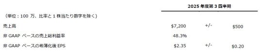 アプライド マテリアルズの2025年度第3四半期の売上高、非GAAPベースの売上総利益率、非GAAP ベースの希薄化後1株当たり利益の見通しは、概算で以下のとおりです。