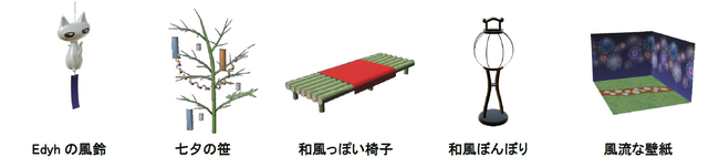 甚平衣装に合わせた和風な家具セットです。HYDEオリジナルキャラクター「Edyhの風鈴」、七夕を感じさせる「七夕の笹」のほか、和を感じさせるアイテムがセットになっています。