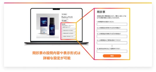 W2 Repeat Medicalでは、第一類医薬品の販売時に必要な問診対応をオンライン上で完結することが可能です。管理画面にて紐づけを行って頂くことで、対象商品の購入時に問診票を自動でポップアップ表示させることが可能。また、問診票は各商品ごとに設問・表示形式・回答を自由に設定できます。