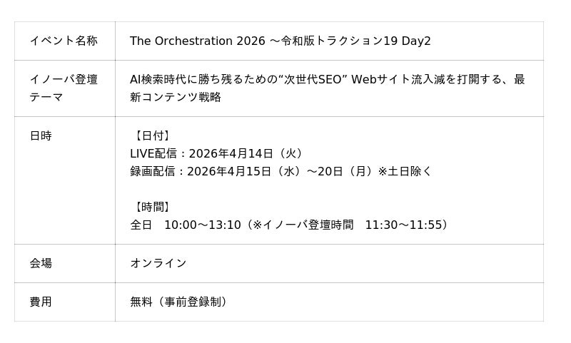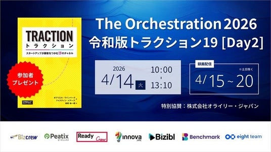 BtoBマーケティング支援を展開する株式会社イノーバ(本社:東京都新宿区、代表取締役社長:宗像 淳、以下「イノーバ」)は、2026年4月14日(火)、各領域のトップランナー企業19社が登壇するオンラインカンファレンス 株式会社Bizibl Technologies主催『The Orchestration 2026 ~令和版トラクション19 Day2』に登壇いたします。