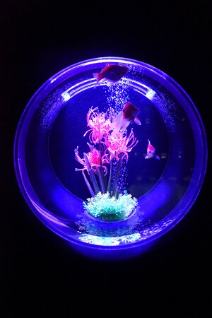 アートギャラリーのように丸い水槽が並び、様々な種類の金魚をご鑑賞いただける作品。各水槽内を秋の花・彼岸花が彩ります。秋のエモい空間で、金魚のコレクションをお楽しみください。