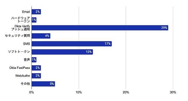 パスワードを除くMFA認証要素に限ると、Okta Verifyプッシュ通知(29%)が最も多く利用されており、次いで