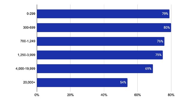 従業員数699人未満の組織ではMFAの導入率が高く(79%~80%)、従業員数2万人以上の組織では導入率が低い(54%)傾向にあります。