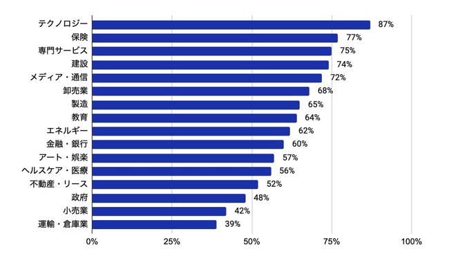 テクノロジー業界では、アカウントログインの87%がすでにMFAを導入しています。続いて、保険業界(77%)、専門サービス業界(75%)、建設業界(74%)、メディア・通信業界(72%)が、上位5を占めています。政府(48%)、小売(42%)、ヘルスケア・医療業界(56%)など、規制の厳しい業界でのMFA導入率が遅れている傾向が見られます。