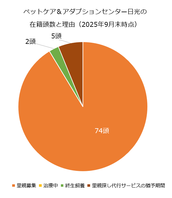 現在、ペットケア&アダプションセンター日光には2025年9月末時点で81頭が生活し、主に治療を終えた、または回復期にある74頭が里親を募集中です。なお、5頭は里親探し代行サービスの猶予期間中のため募集待ち、2頭は終生飼養を行う予定です。
