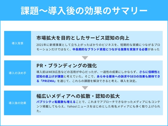 2021年に新規事業として立ち上げたばかりのビジネスを中長期的なブランド資産につなげるための施策として、2023年2月より、調査PRサービス「PRIZMA」を活用。
