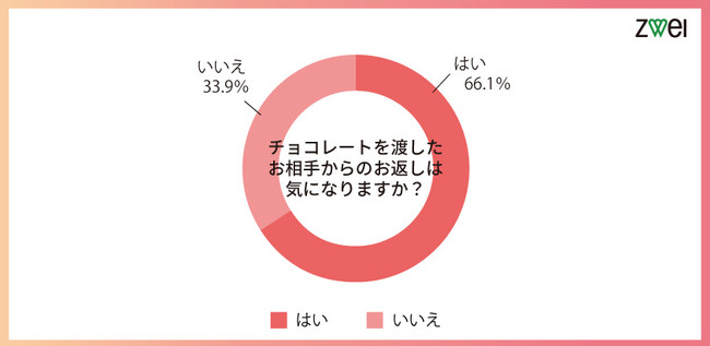 「はい」と回答した女性は66.1%おり、チョコレートを受け取った男性は女性へのお返しを忘れずに用意すると、女性から喜んでもらえそうだ。
