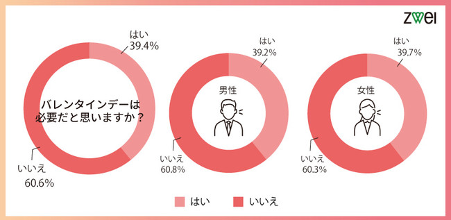 5~6割の男女がバレンタインデーを意識したりバレンタインデートをしたいと思っている一方で、6割の男女がバレンタインデーは「必要ない」と答える意外な結果となった。