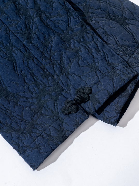 襟のタブや袖には、古くから縁起物として親しまれてきた「水引」を思わせるノットボタンをあしらいました。同素材のトラウザーズとのセットアップスタイルも可能です。
