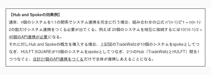 *2) Hub and Spoke: Hubは自転車の車輪軸を表し、上記図のTradeWaltzやHULFTのような各システムの真ん中にあるつなぎ役を指す言葉であり、Spokeは上記図の人事・給与管理システムや会計管理システムのようにHubから伸びる線を指す。元々は物流網をどのように設計すると良いか、という議論から生まれた言葉であり、現在はIT業界でシステム連携(情報流通)をどのように設計すれば良いか、という議論で使われる。