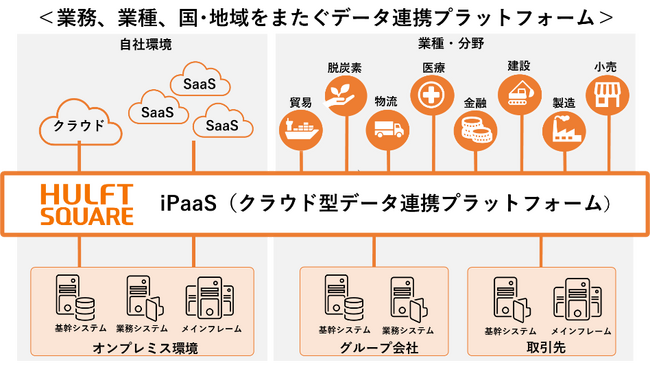 HULFT Squareは、DX実現に必要な「データ活用するためのデータ準備」や「業務システムをつなぐデータ連携」を支援する日本発のiPaaS(クラウド型データ連携プラットフォーム)です。オンプレミス・クラウド・SaaSなどの環境に分散し管理されているさまざまなデータを、業務システム間、業種、国・地域をまたぎデータ連携させることができます。