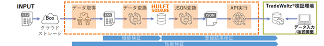 HULFT Squareに実装したTradeWaltz-API連携のモジュールを使い、下記シナリオで実証試験を行いました。