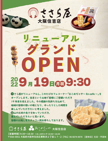 創業98年の老舗米菓メーカー日の出屋製菓産業株式会社(本社:富山県南砺市、代表取締役社長:川合 声一)より、直営店ブランド・しろえびせんべいでお馴染みの【ささら屋】が、大阪市住吉区にて2022年9月19日(月)にリニューアルグランドオープンいたしました。16日から3日間の近隣住民様向けの特別招待会では、リニューアルオープン限定のお楽しみ袋が大人気でした。