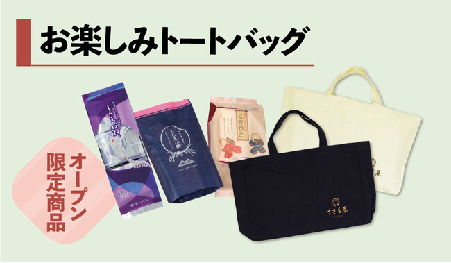 特別招待会で人気のお楽しみ袋は、ささら屋のロゴがあしらわれた黒と白のトートバッグに、人気商品3種が入った大変お買い得な詰め合わせ商品です。