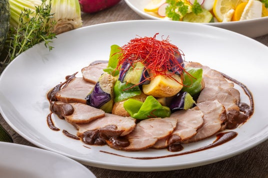 野菜の素材そのものを活かしたバーニャカウダやせいろ蒸しの他、野菜と豚肉を甘辛く炒めたご飯のすすむ中国の家庭料理「地三鮮(ディサンシェン)」、ディナーでは牛リブロースのBBQローストなど多彩な料理が並びます。