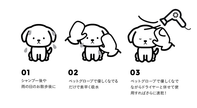使い方はとても簡単。お風呂上がりや雨の日のお散歩の後に、ペットグローブを両手にはめて優しくなでるだけです。ドライヤー前に使用することでドライヤー時間の短縮にもなります。