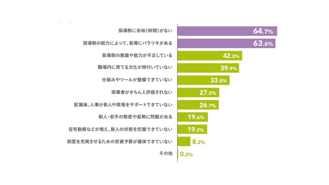 新人・若手社員のOJTについて、89%の育成施策担当者が、「全体的に課題がある」「部分的に課題がある」と回答しました。課題の1位に挙がったのは、「指導側に余裕(時間)がない」(64.7%)、次いで「指導側の能力によって、指導にバラツキがある」(63.6%)、「指導側の意識や能力が不足している」(42.0%)となり、OJTの主な課題は「指導者側」にあることが明らかになりました。