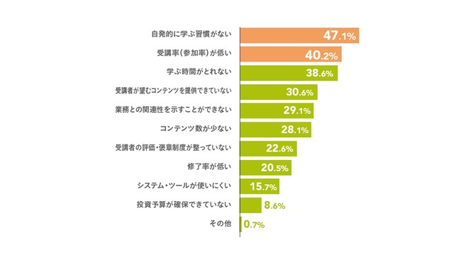 ■約77%が自己啓発施策に「課題あり」。「自発的に学ぶ習慣がない」が課題の1位に