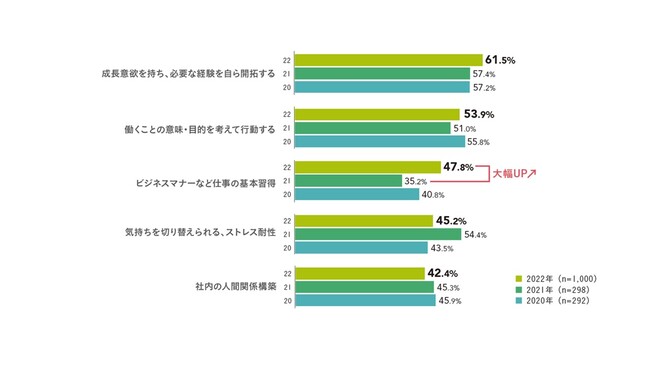 課題の1位に挙げられたのは「成長意欲を持ち、必要な経験を自ら開拓する」(61.5%)でした。2020年から3年変わらずトップに挙がっており、多くの育成施策担当者が新人・若手社員に課題感を持っているにもかかわらず、改善策を見出しにくい普遍的なテーマであることがわかります。また、昨年と比較して一番ポイントが上がっていたのが、「ビジネスマナーなど仕事の基本習得」(47.8%、昨年より12.6%増)でした。ビジネスマナーは本来であれば入社初期の研修で学ぶような基本的な課題です。コロナ禍が3年目となり企業により働き方が定まってきたことで、本来の基本的な課題に目を向ける余裕が出てきた、と考えられるかもしれません。