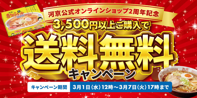 内容:河京公式オンラインショップ(https://shop.kawakyo.co.jp/)にて対象期間中に商品3,500円以上ご購入いただいた商品は送料無料です。