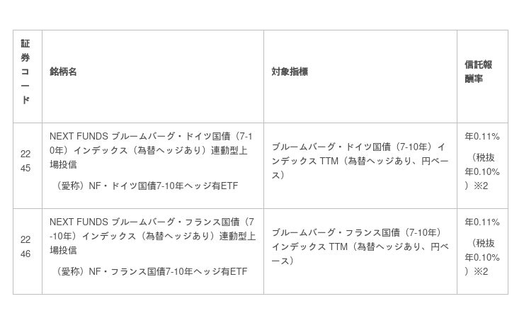 野村アセットマネジメント株式会社(CEO兼代表取締役社長:小池広靖、以下「当社」)は、「ブルームバーグ・ドイツ国債(7-10年)インデックス TTM(為替ヘッジあり、円ベース)」、「ブルームバーグ・フランス国債(7-10年)インデックス TTM(為替ヘッジあり、円ベース)」を連動対象とするETF(以下総称して「本ETF」)を、東京証券取引所に上場しました※1。本ETFは、本日より全国の証券会社を通じて取引所での売買が可能となります。