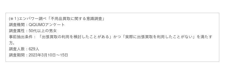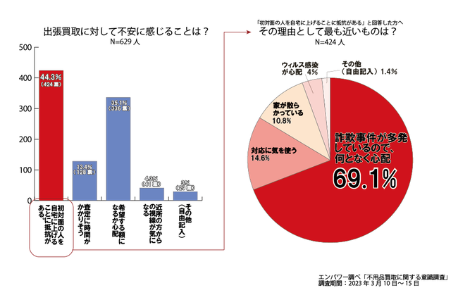 一方、50代以上の男女を対象にしたアンケート調査では、「出張買取の利用を検討したことがあるものの実際に利用に至らなかった方」の割合は、100%という結果になりました。また、実際に出張買取の利用に至らなかった理由についての設問では、「初対面の人を自宅に上げることに抵抗がある」と回答した人が44.3%という結果に。さらに、そのうち69.1%が詐欺事件の影響による不安であることが分かりました。(※1)多くの中高年・シニアが、出張買取をやってみたいと思一方で、自宅に人を入れることが不安要素の1つであることが分かります。