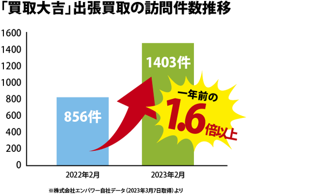 「買取大吉」では出張買取の訪問件数が年々増加傾向にあります。特に昨対2月では1.6倍以上の増加となりました。リユース市場全体が拡大傾向にある中、出品・梱包作業や、リサイクルショップまで足を運ぶといった手間がかからない出張買取。時間の無い主婦の方や、気軽な外出が難しいシニア層を中心に、今後も需要拡大が見込めます