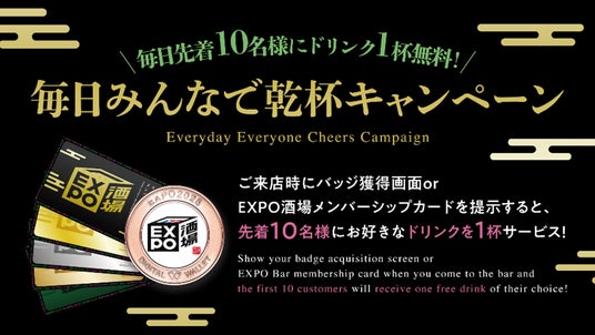 - EXPO酒場本店来店時に会員証を提示すると、毎日先着10名様に対象の中からお好きなドリンクを1杯サービスします!