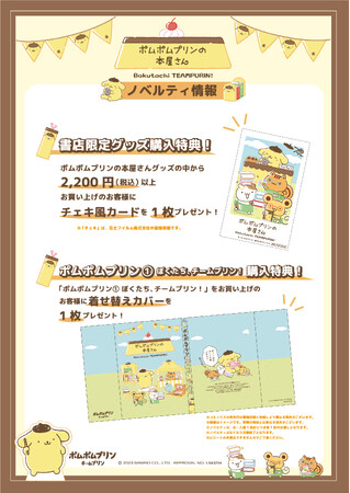 フェア開催店舗では、書店限定グッズを2,200円(税込)以上お買い上げのお客様に、ノベルティとして「チェキ風カード」を1枚プレゼントいたします。また書店限定グッズと同時発売の「チームプリン漫画」コミックス『ポムポムプリン1. ぼくたち、チームプリン!』を1冊お買い上げのお客様に「着せ替えカバー」を1枚プレゼントいたします。