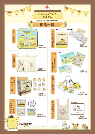 株式会社サンリオの人気キャラクター「ポムポムプリン」が『ちむぷり』ことチームプリンのマフィン、スコーン、ベーグルと一緒に過ごすたのしい毎日が描かれた「チームプリン漫画」のコミックス『ポムポムプリン1. ぼくたち、チームプリン!』の発売を記念して、『ポムポムプリンの本屋さん ぼくたち、チームプリン!』フェアを全国の一部書店にて9月15日(金)より開催いたします。このフェアでは、プリンとお友だちが本屋さんの店員に挑戦している描き下ろしオリジナルストーリーからポムポムプリンの本屋さん書店限定グッズを展開いたします。商品ラインナップは、ミニタオル、バネポーチ、パタパタ付箋メモ、A4クリアファイル2枚セット、ボックスロールステッカー、4連キーホルダー、マルシェバッグ、ミニフレームマグネット3種の全8アイテムです。