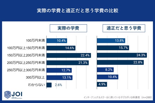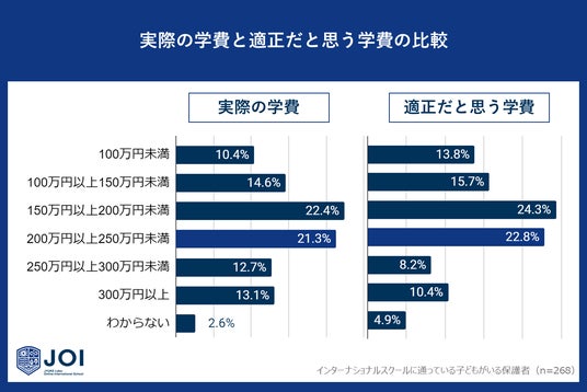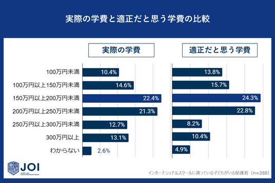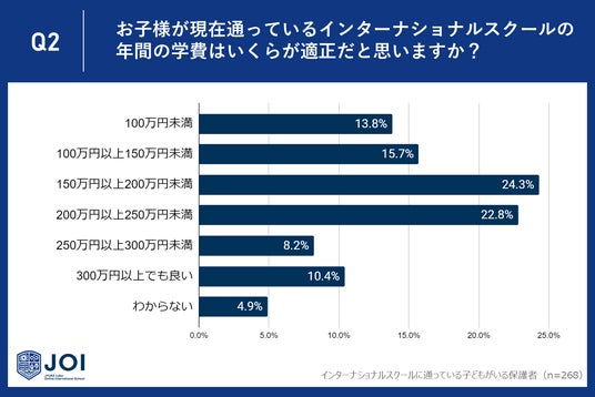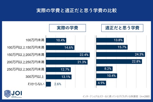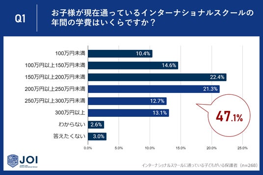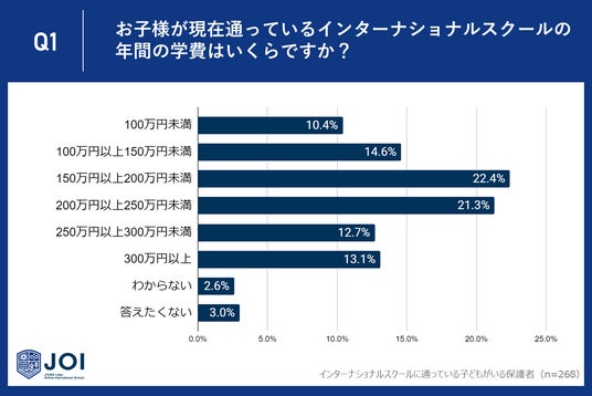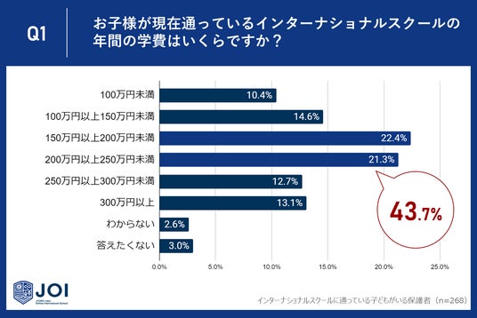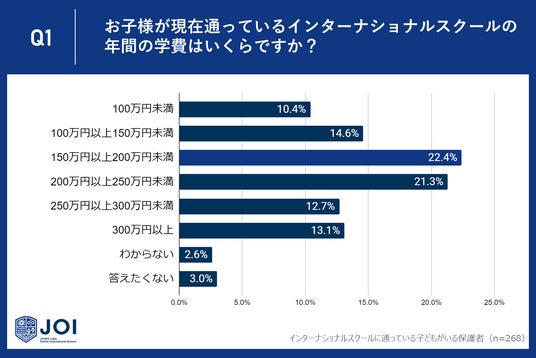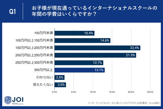 じゅけラボOnlineインターナショナルスクールJOI(所在地:大阪市北区、代表取締役:後藤智則)は、子どもを現在インターナショナルスクールに通わせている保護者268人に、インターナショナルスクールの学費に関するアンケート調査を実施しました。
