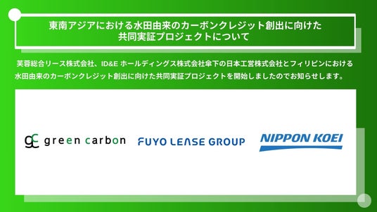 Green Carbon株式会社(東京都港区、代表取締役:大北 潤、以下Green Carbon(読み:グリーンカーボン)はこの度、 芙蓉総合リース株式会社(東京都千代田区、代表取締役社長:織田 寛明、以下、芙蓉リース)、ID&E ホールディングス株式会社傘下の日本工営株式会社(東京都千代田区、代表取締役社長:金井 晴彦、以下、日本工営)とフィリピンにおける水田由来のカーボンクレジット※1創出に向けた共同実証プロジェクト(以下「本プロジェクト」)を開始しましたのでお知らせします。