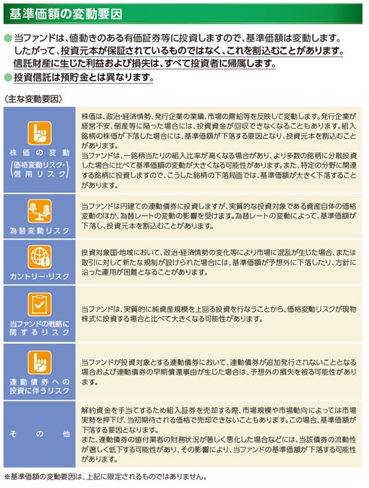 - 投資信託は値動きのある有価証券等に投資しますので、基準価額は大きく変動します。したがって、投資元本が保証されているものではありません。信託財産に生じた利益および損失はすべて投資者に帰属します。投資信託は預貯金とは異なります。