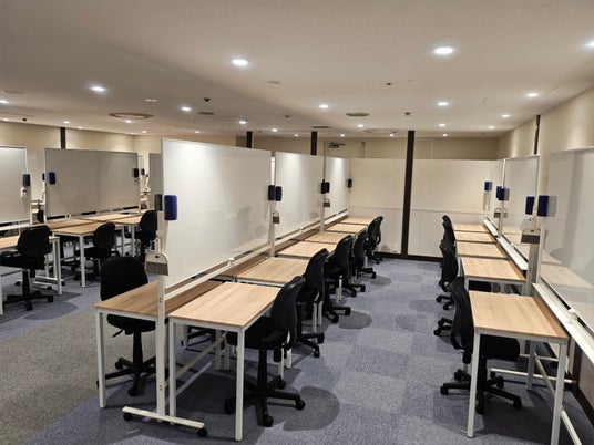 新教室では、生徒一人ひとりが十分な学習スペースを確保できるよう、広々とした空間設計を採用しています。エントランスから自習専用ブース、指導エリアへの動線も整理され、学習に没頭できる環境を構築しました。また、定期的な面談や保護者さまとの定期的な学習相談を実施するための独立した面談ブースも備えています。
