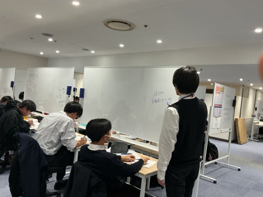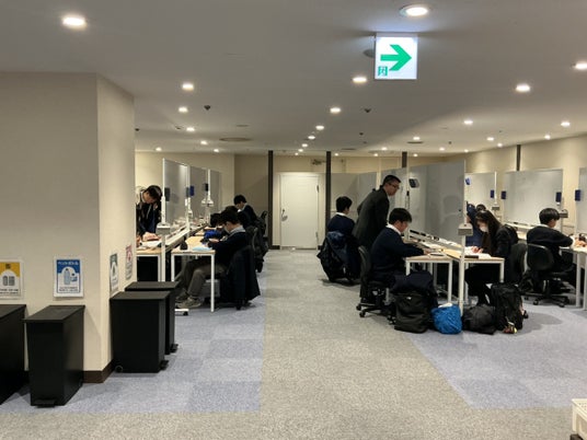 移転リニューアルから約2週間が経過し、新教室は中高一貫校生たちの「第二の勉強部屋」として本格的に稼働しています。 広々とした学習スペースには、各指導ブースに大きなホワイトボードが完備され、講師による指導と生徒自身の演習が効率的に行われています。また、新たに拡充された自習ブースも連日多くの生徒に利用されており、静かで集中できる環境のなか、学年末試験の振り返りや新学年への準備を進める活気ある学習空間が形成されています。