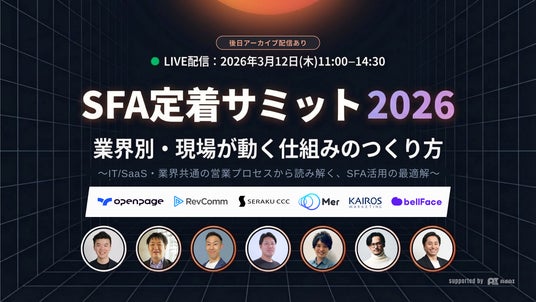 “次の一手”がデータでわかるMA+SFA一体型ツール「Kairos3(カイロススリー)」を提供するカイロスマーケティング株式会社(本社:東京都渋谷区、代表取締役:佐宗 大介、以下「当社」)は、株式会社openpageが主催するオンラインカンファレンス「SFA定着サミット 2026|業界別・現場が動く仕組みのつくり方 ~IT/SaaS・業界共通の営業プロセスから読み解く、SFA活用の最適解~」に、当社取締役 COO 白井 則行が登壇することをお知らせします。