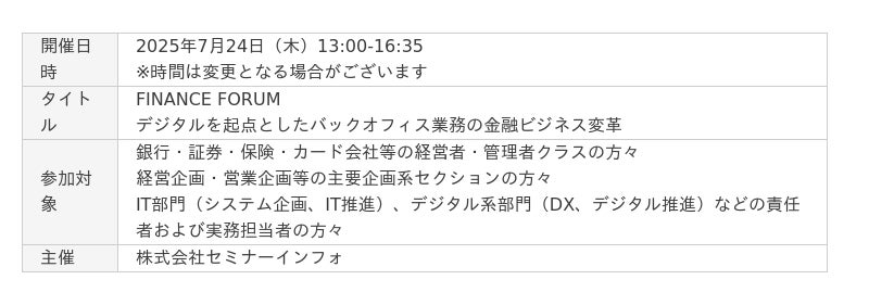 株式会社セミナーインフォ(本社:東京都千代田区 代表:小西 亘)は、2025年7月24日(木)にFINANCE FORUM「デジタルを起点としたバックオフィス業務の金融ビジネス変革」を開催することとなりました。