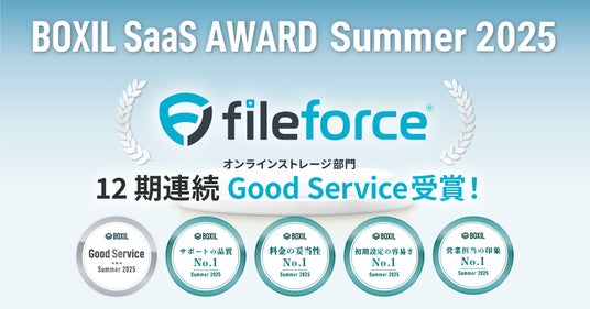 ファイルフォース株式会社(本社:東京千代田区、代表取締役:サルキシャン アラム)が提供する「Fileforce」 は、スマートキャンプ株式会社が主催する「BOXIL SaaS AWARD Summer 2025」のオンラインストレージ部門で 「Good Service」、「サポート品質No.1」「料金の妥当性No.1」「初期設定の容易さNo.1」「営業担当の印象No.1」に選出されました。「Good Service」は12期連続での受賞となります。